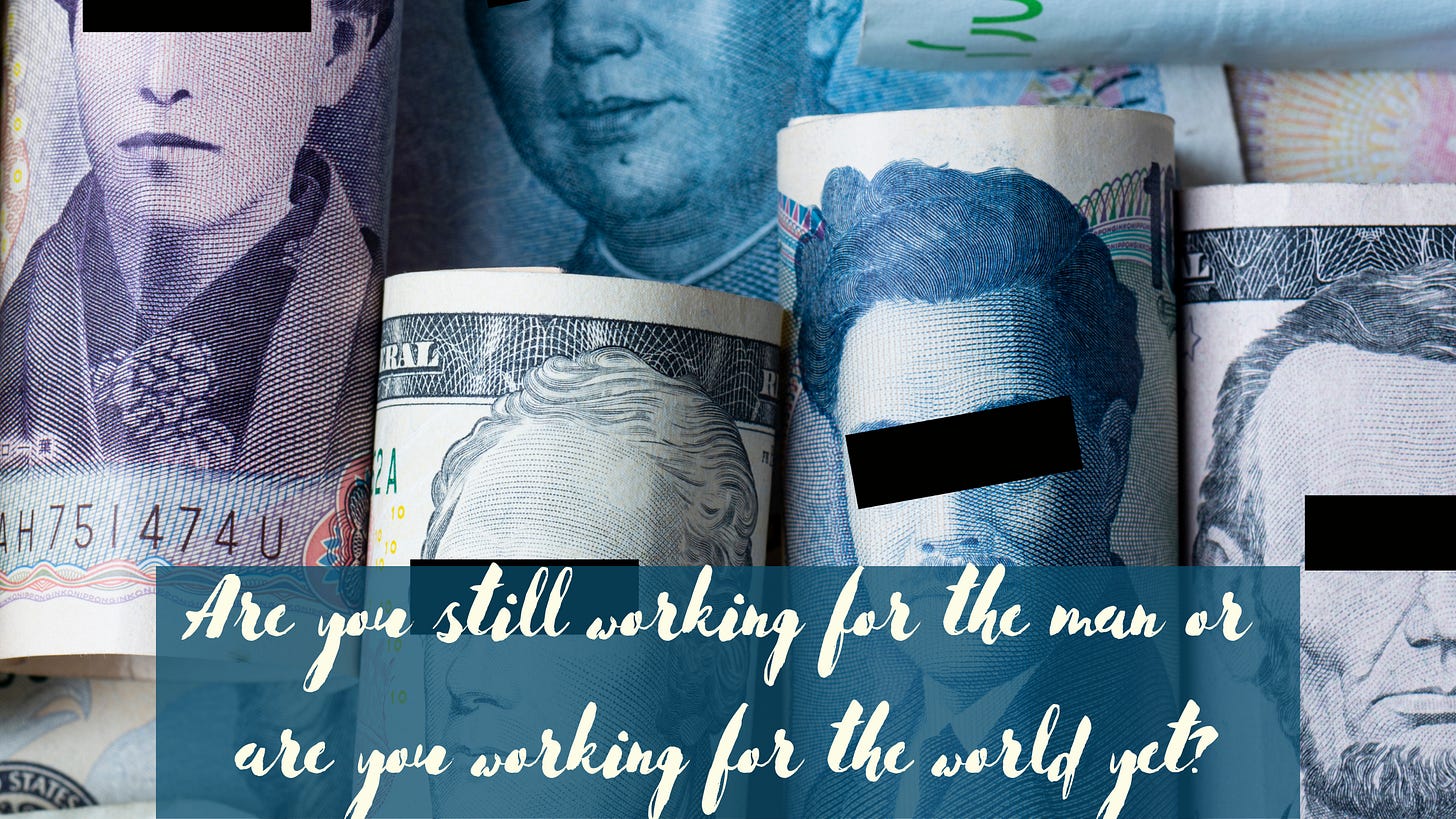 A backdrop of rolled up banknotes from different countries with the eyes of the people portrayed on them blacked out. Cursive text on a half transparent teal background at the bottom says: Are you still working for the man or are you working for the world yet?